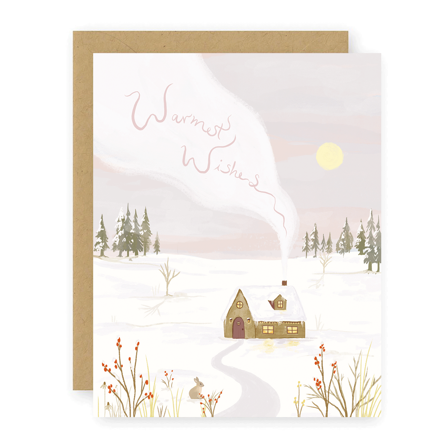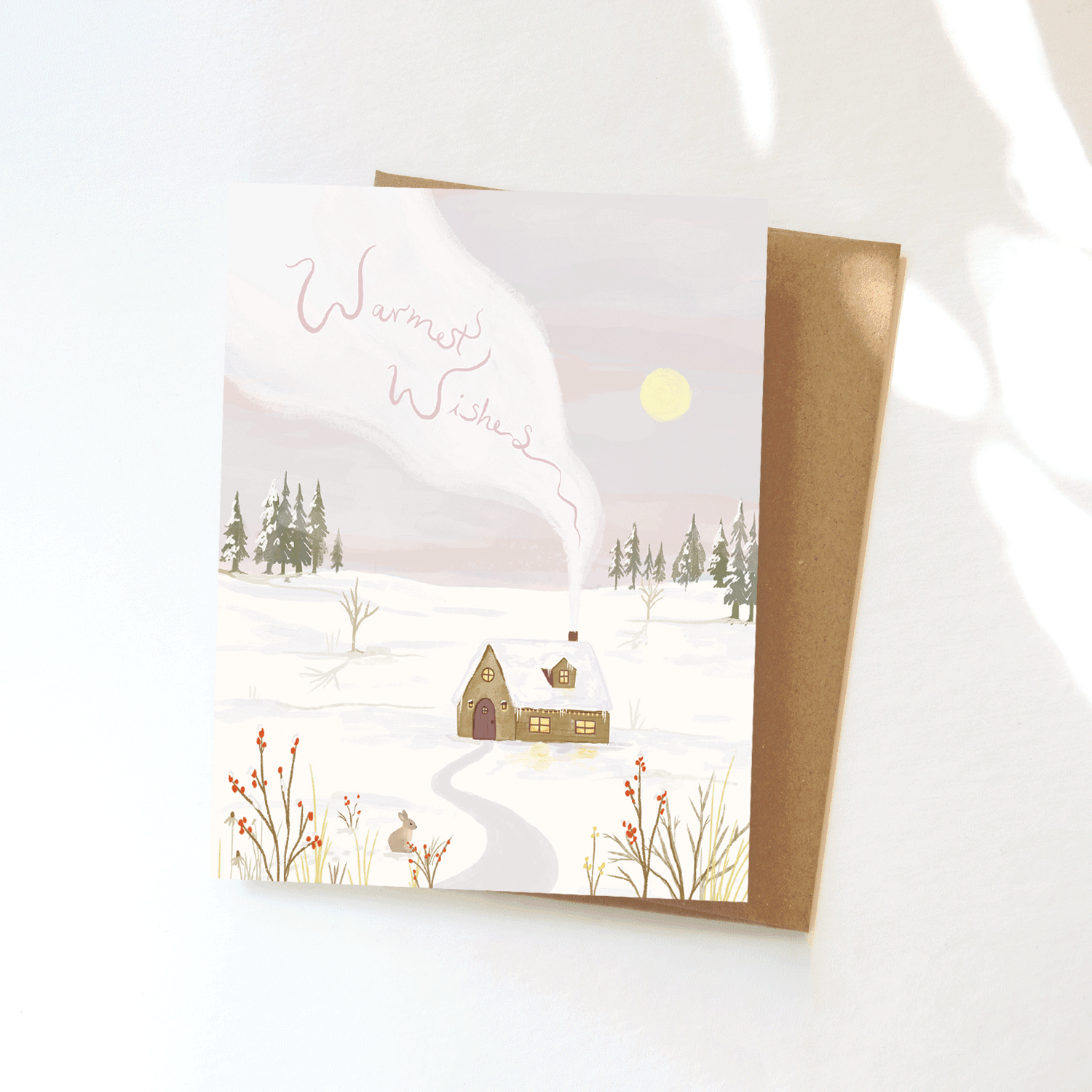 Send a little warmth this season with the Cozy Winter Cabin Card, featuring a peaceful snowy landscape, winter foliage, cozy cabin, and a little rabbit. Perfect for holiday greetings, solstice notes, winter well wishes, or simple messages of love from afar.