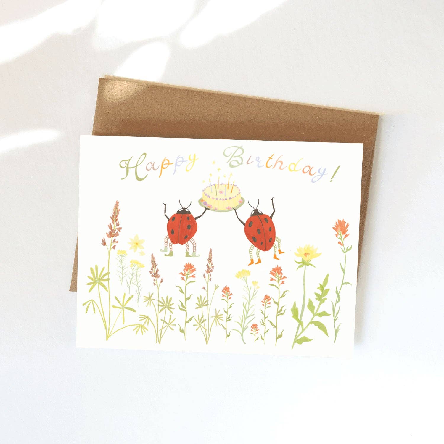 A cheerful illustrated birthday card featuring dancing ladybugs celebrating with a garden-party cake, perfect for kids and anyone young at heart!